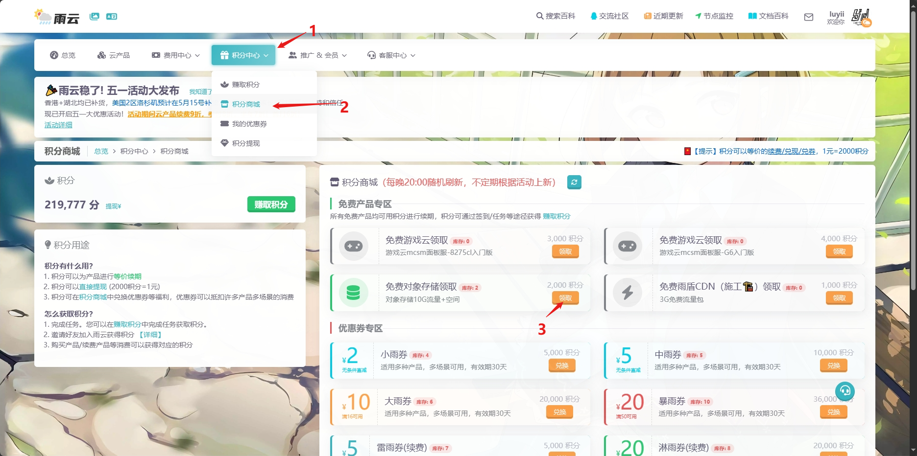 获得账号后,推荐去积分商城免费领一个(只需签到1星期即可免费领取)