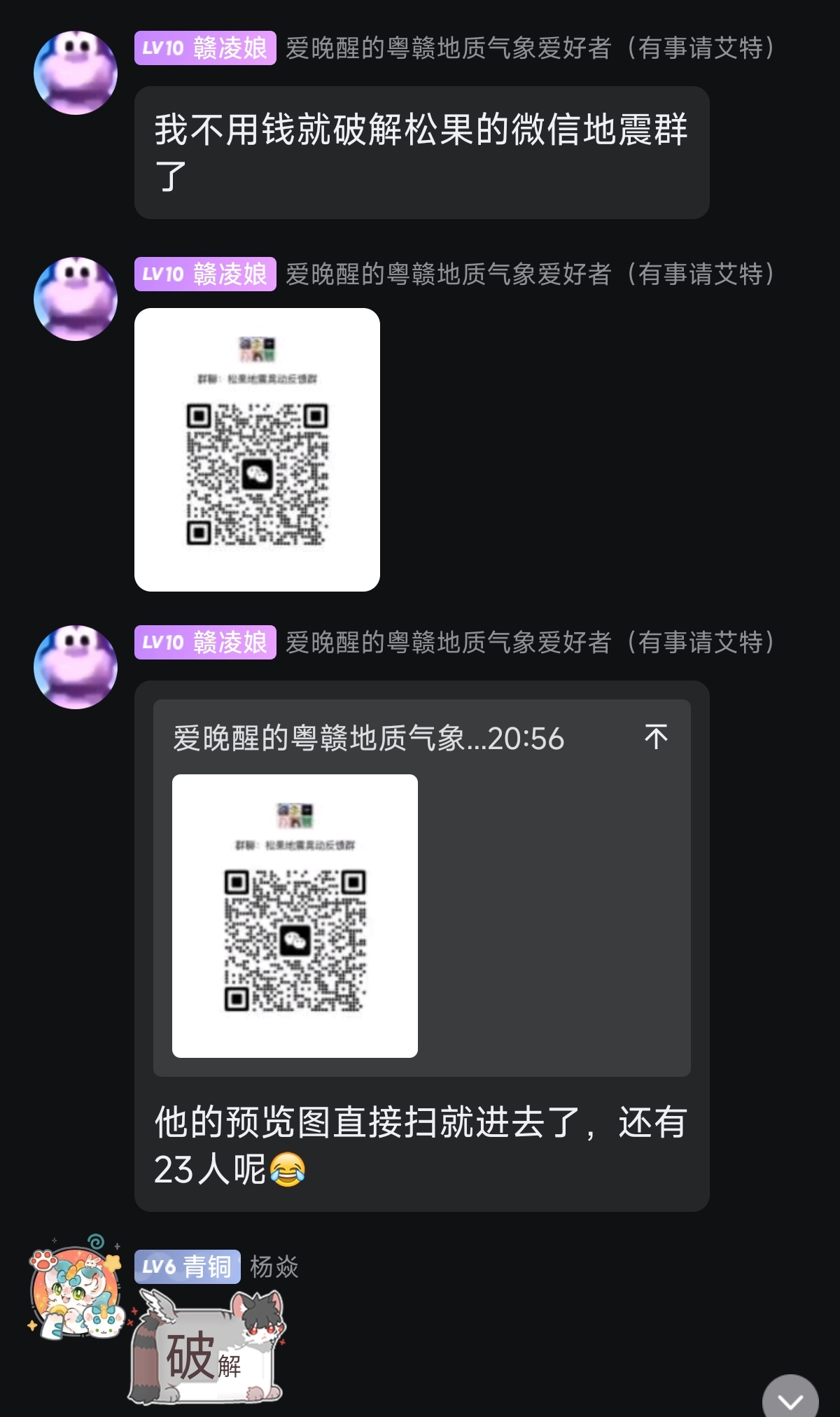 起初收费进入“松果地震摇晃反馈群”,但有细心的群友发现了起入群二维码以缩略图泄(gong) 露(kai):