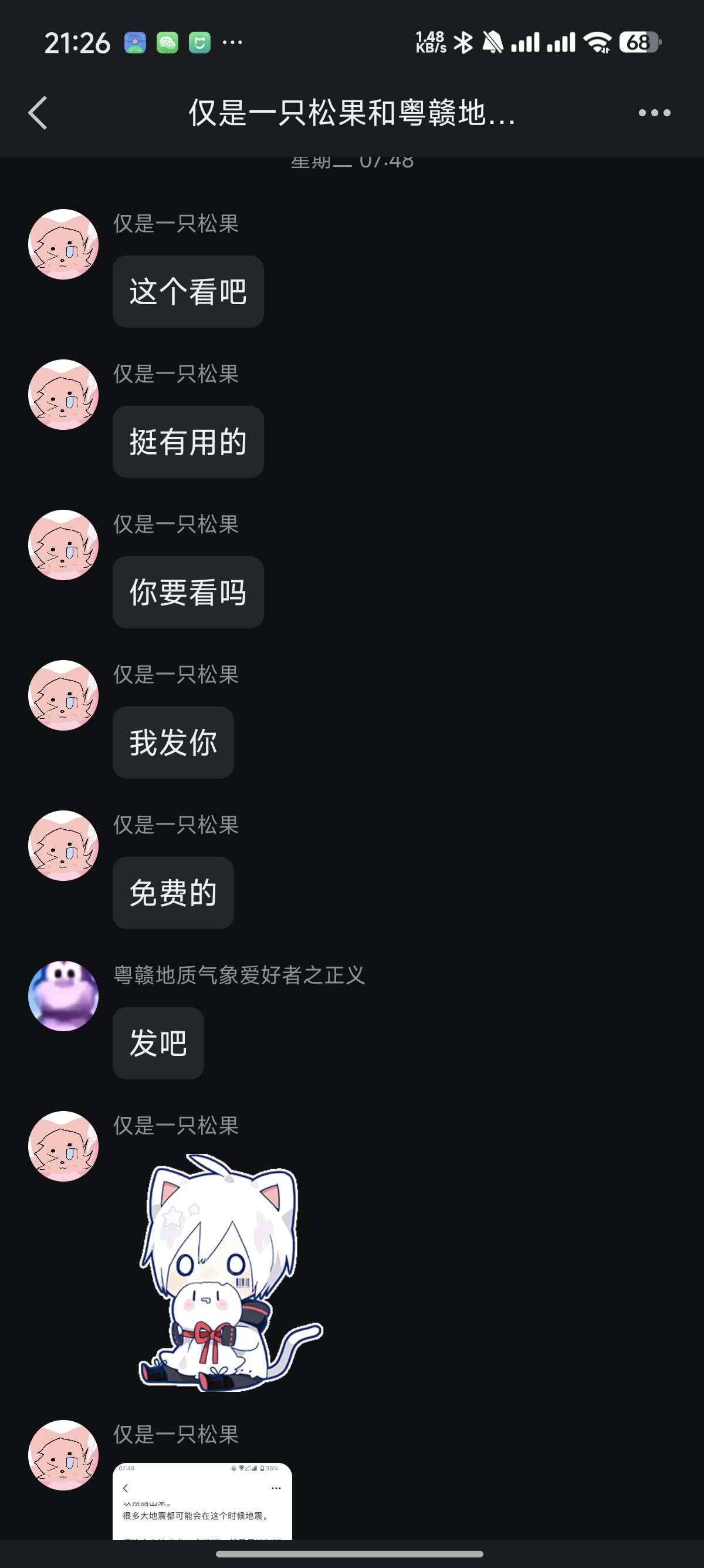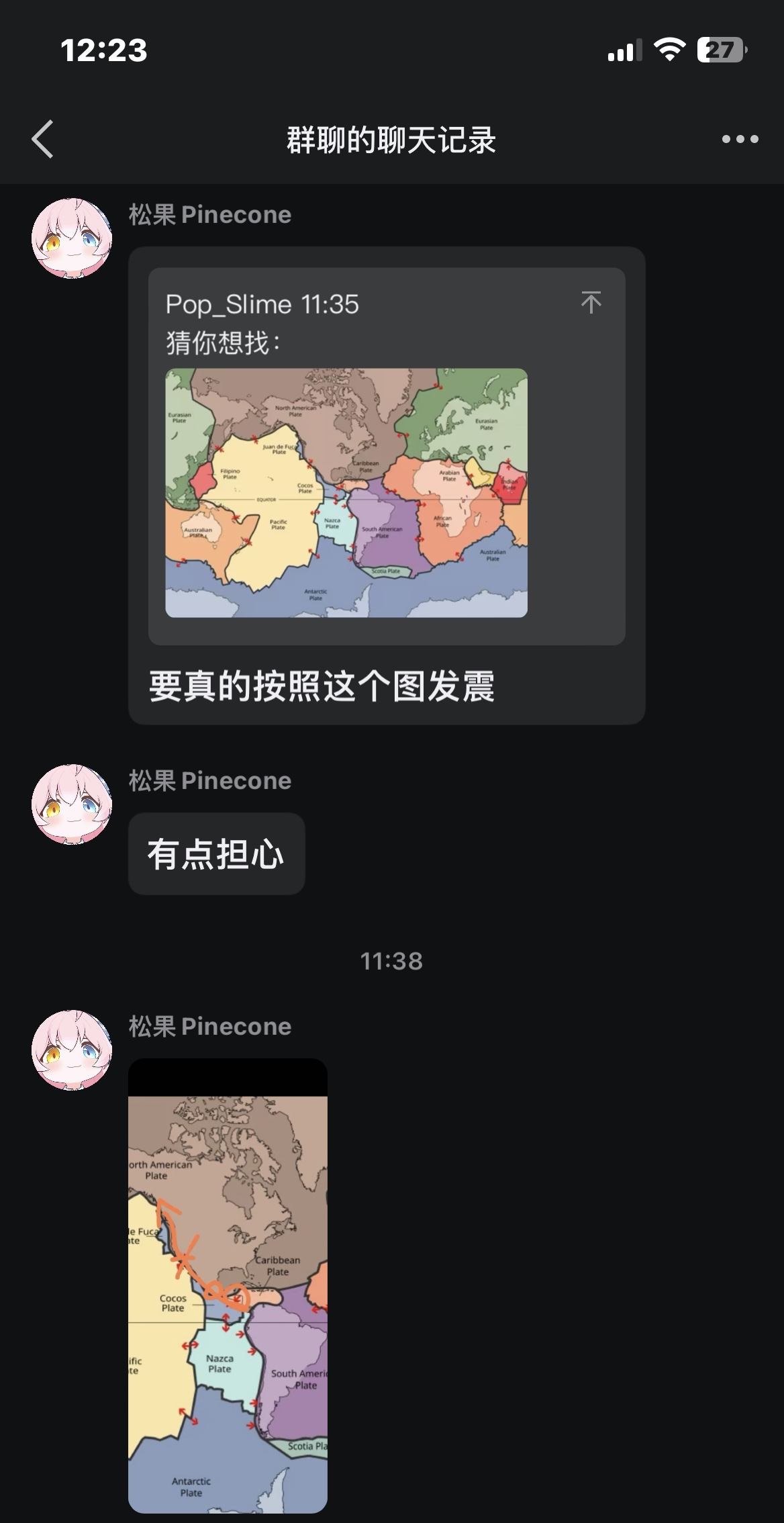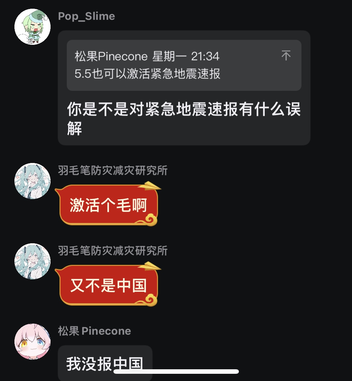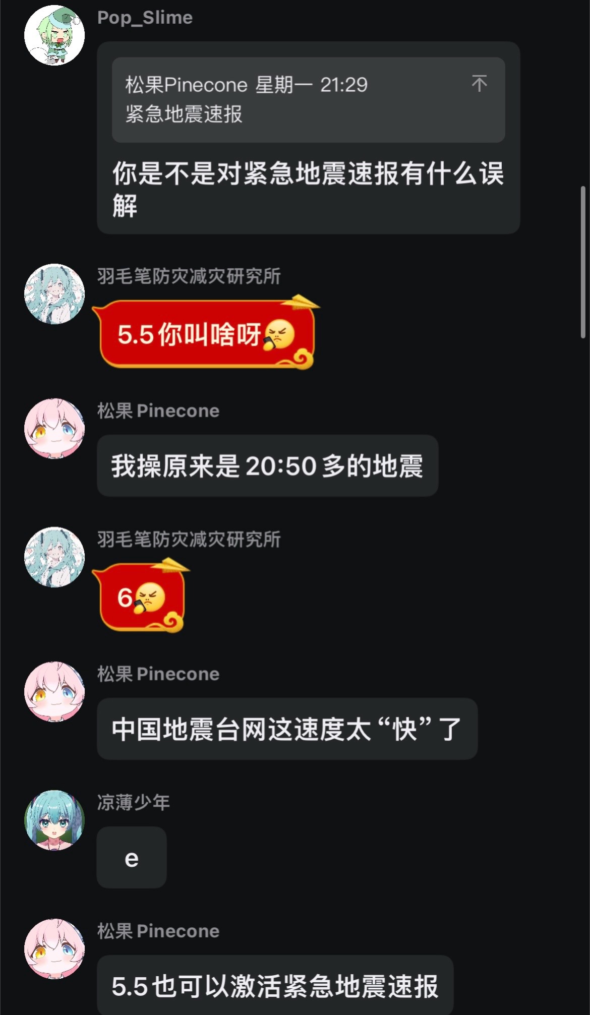 然后他尝试进入EEW预报爱好交流群,成功过一次,但之后进入群内黑名单。(之后放出来了)