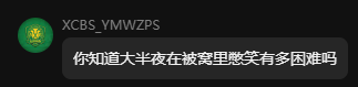由于其本身曾说过其是重度抑郁,又因为发言过典,后自行退群后找到HomoOS发送了一系列破防言论,并带有很多经典的抑郁言论,说自己几天来一直失眠,“tmd老子学不上了!!!”这样自暴自弃的话。