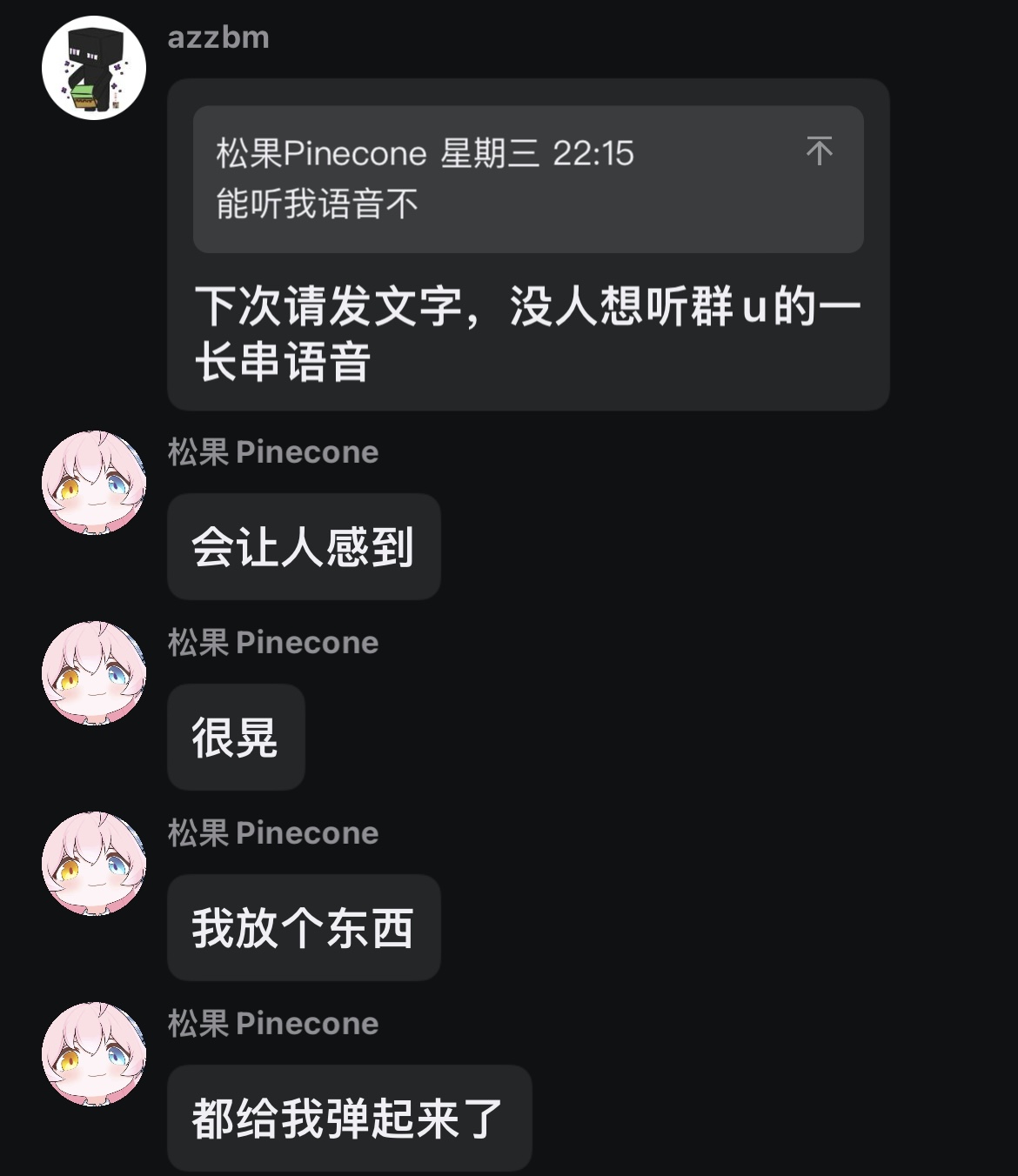 2024年8月29日,一位叫“松果PineCone”的用户在azzbm粉丝群正经EEW交流群内发表了以下言论。